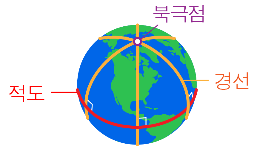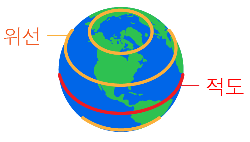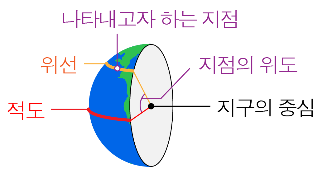 지구의 중심에서 적도와 나타내고자 하는 지점을 지나는 위선이 이루는 각도이다.