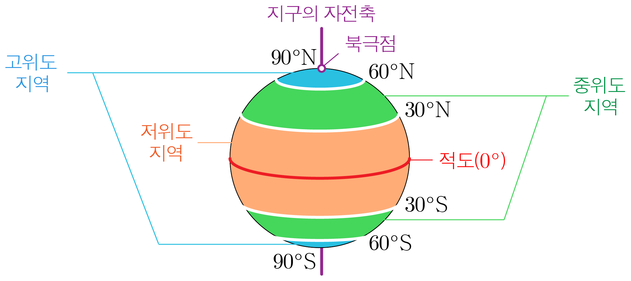 일반적으로 위도가 인 지역을 저위도 지역, 인 지역을 중위도 지역, 인 지역을 고위도 지역이라 한다.