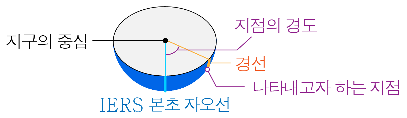 지구의 중심에서 본초 자오선(국제지구자전좌표국이 정한 경도의 기준선)과 나타내고자 하는 지점을 지나는 경선이 이루는 각도이다.