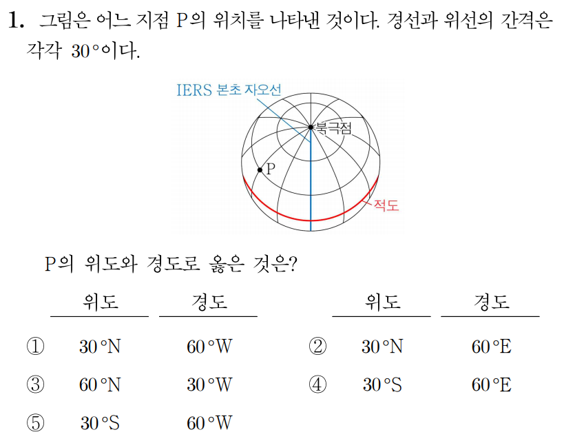지구의 중심에서 적도와 를 지나는 위선이 이루는 각도는 이며, 는 적도를 기준으로 북쪽에 위치하므로 의 위도는 이다.