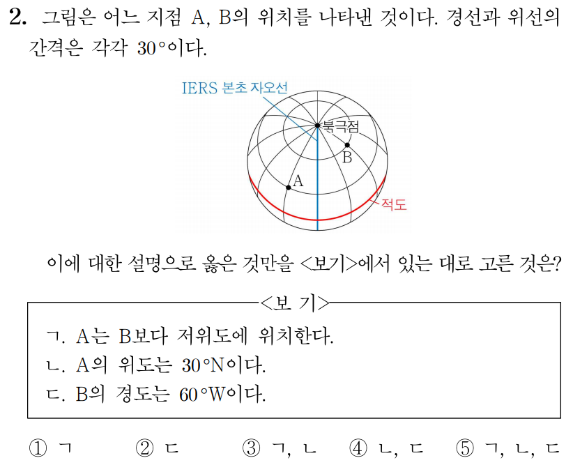 ㄱ. 위도가 작을수록 저위도에 해당하므로 는 보다 저위도에 위치한다. (O)