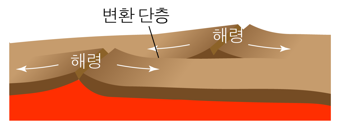 해령이 어긋난 구간을 변환 단층이라 하며 인접한 두 해령에서 서로 다른 해양 지각이 확장될 때,