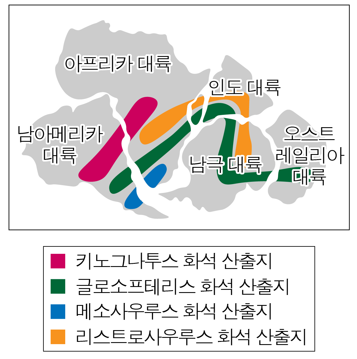 대표적인 예시로 메소사우루스 화석이 남아메리카 대륙과 아프리카 대륙에서 산출되며,