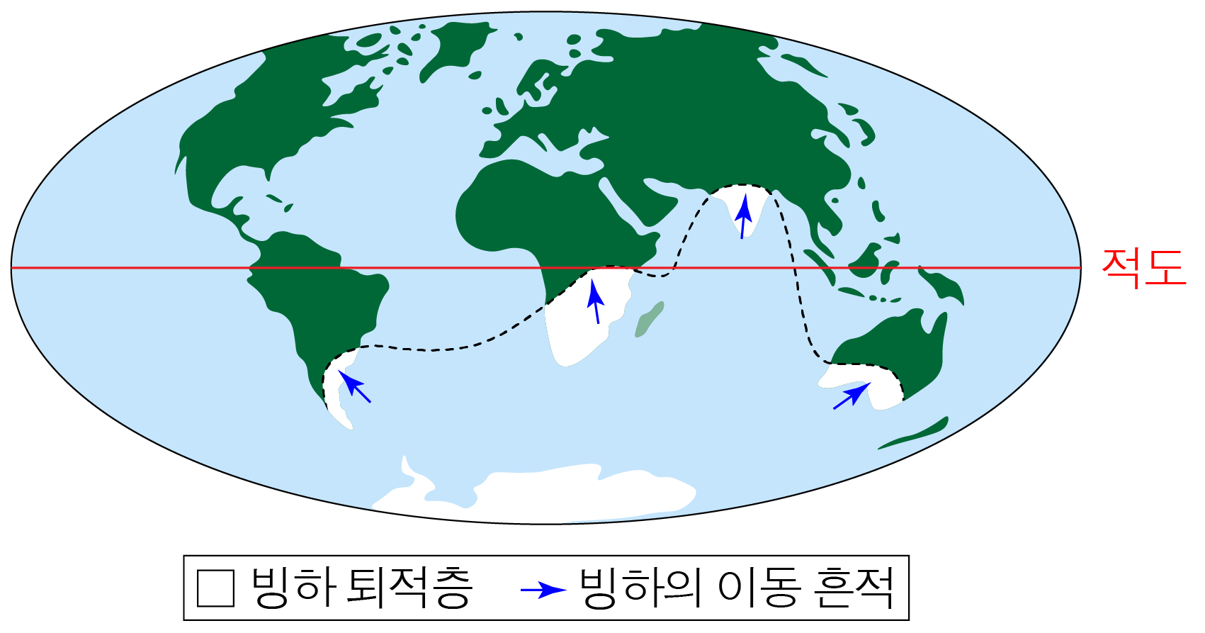 남아메리카, 아프리카, 인도, 남극 및 오스트레일리아 대륙에서 빙하 퇴적층과 빙하의 이동 흔적이 발견된다.