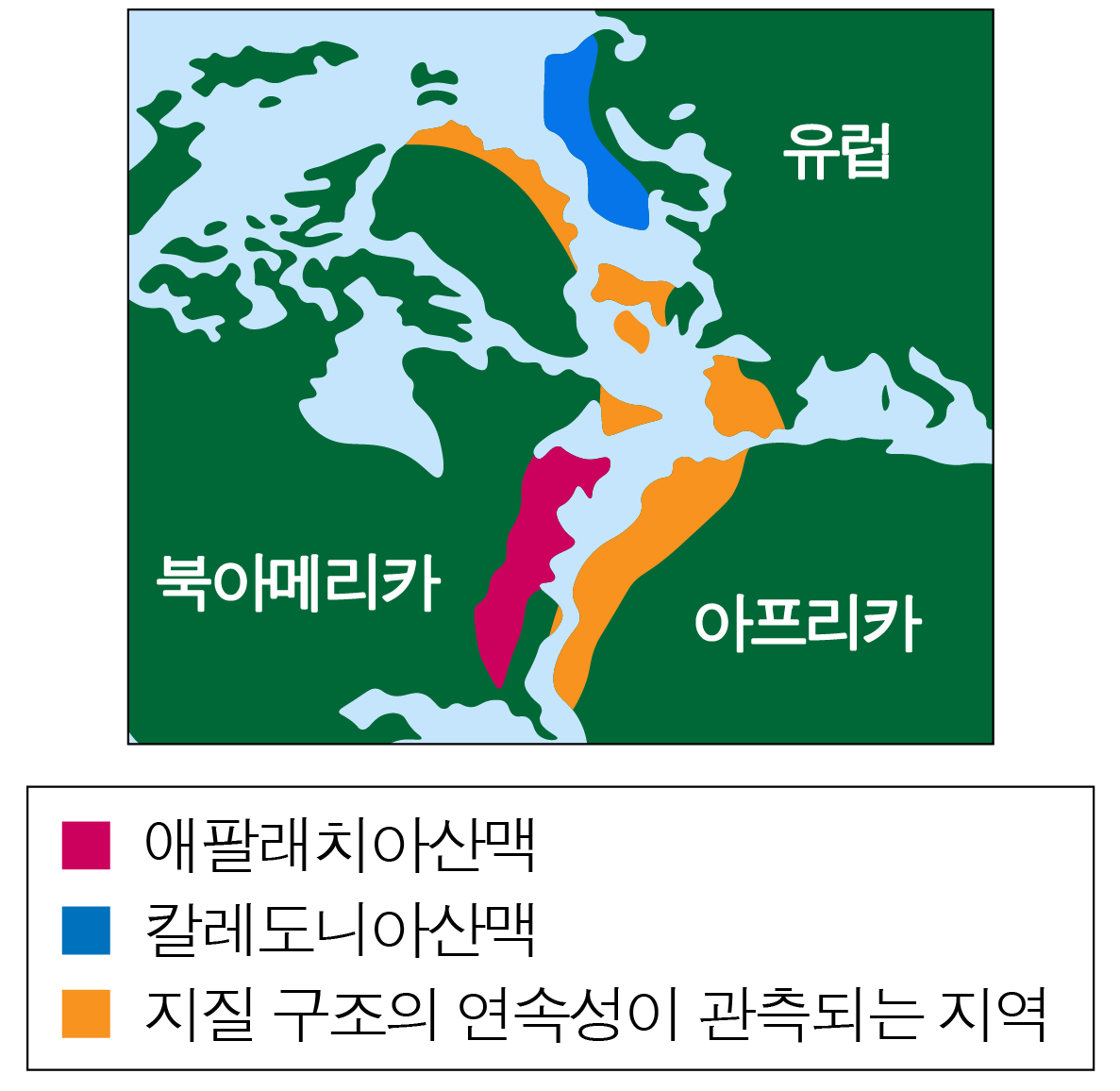 대서양 양쪽 해안에서 발견되는 암석의 지질 구조가 연속성을 갖는다.