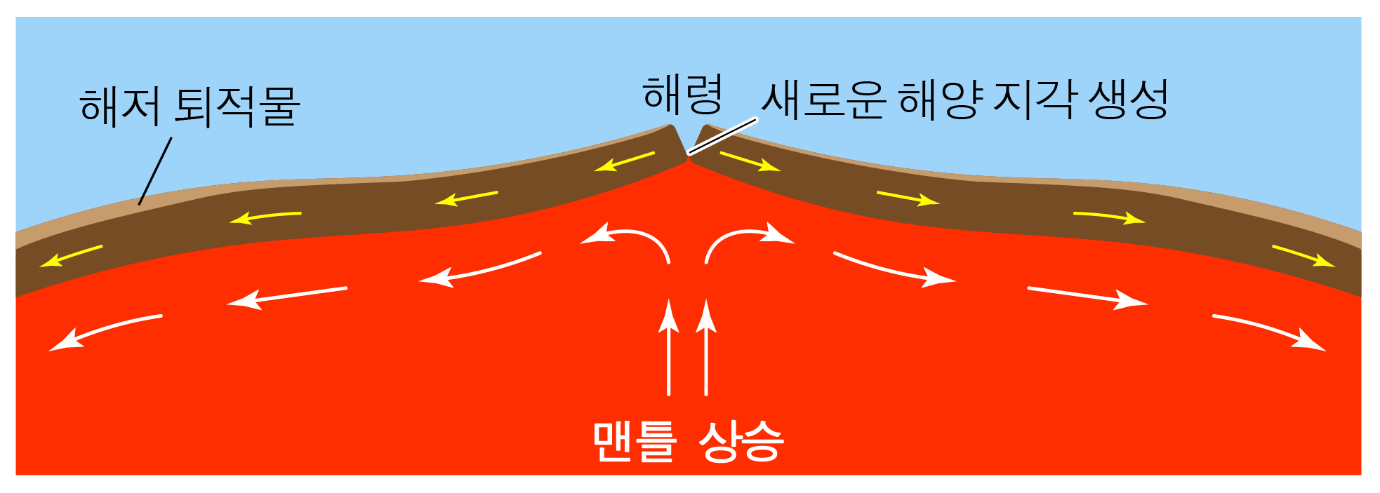 맨틀 대류의 상승부인 해령에서 새로운 해양 지각이 생성되며,