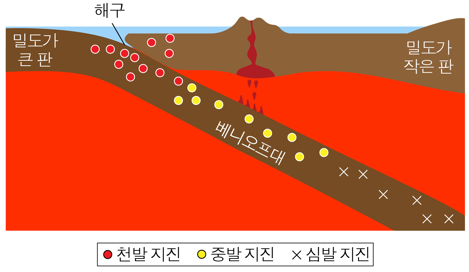 해구에서는 밀도가 큰 판이 밀도가 작은 판 아래로 섭입하므로 밀도가 작은 판 쪽으로 갈수록 진원의 깊이가 점차 깊어진다. 이러한 지진대를 베니오프대라 하며, 베니오프대에서는 지진 활동뿐만 아니라 화산 활동도 활발히 일어난다.
