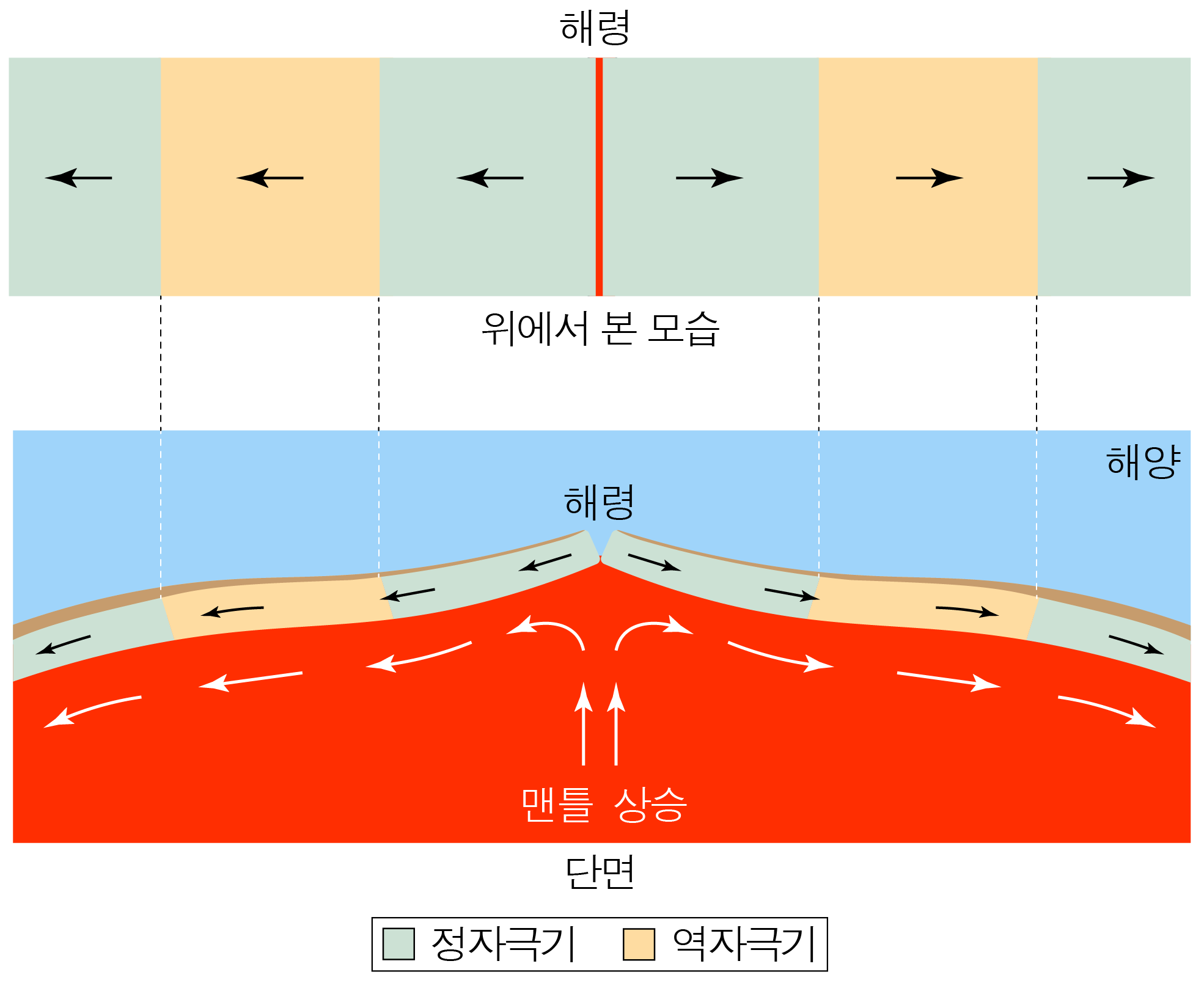 해저 고지자기 줄무늬의 대칭적인 분포는 해령에서 새로운 해양 지각이 생성되면서 확장될 때 지구 자기장의 역전 현상이 반복되어 나타난다.