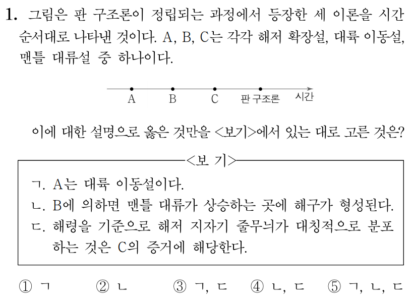ㄱ. 판 구조론은 대륙 이동설 → 맨틀 대류설 → 해저 확장설의 순서를 거쳐 정립되었으므로 A,B,C는 각각 대륙 이동설, 맨틀 대류설, 해저 확장설이다. (O)