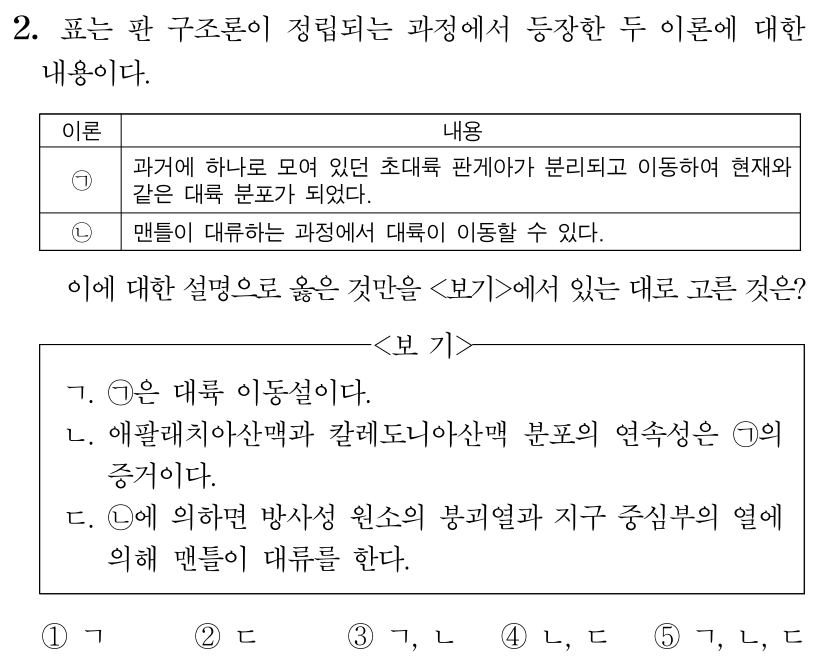 판 구조론은 대륙 이동설 → 맨틀 대류설 → 해저 확장설의 순서를 거쳐 정립되었다.