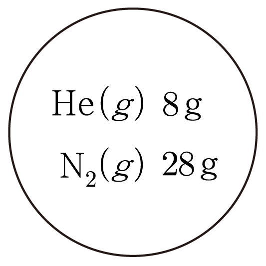 그림과 같이 강철 용기에 H e ( g ) \mathrm{He}(g)H e ( g ) 와 N 2 ( g ) \mathrm{N_2}(g)N 2 ( g ) 가 각각 8 g 8\,\mathrm{g}8 g , 28 g 28\,\mathrm{g}2 8 g 만큼 들어 있다.