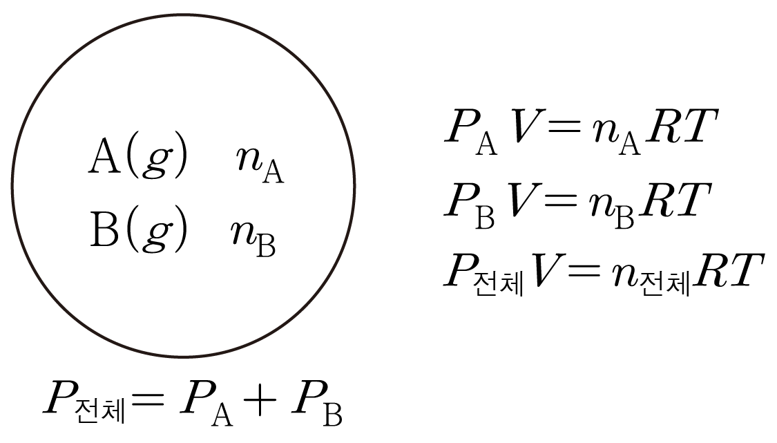 P 전체 P_{\text{전체}}P 전체 은 혼합물의 전체 몰 수(n 전체 = n A + n B n_{\text{전체}} = n_\mathrm{A} + n_\mathrm{B}n 전체 = n A + n B )를 이상 기체 상태 방정식에 적용하여