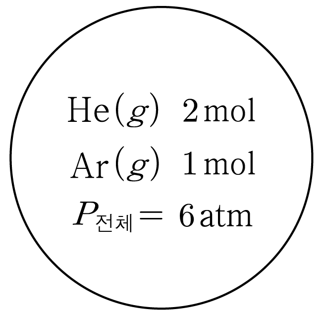 그림과 같이 온도 T TT 에서 강철 용기에 H e ( g ) \mathrm{He}(g)H e ( g ) 와 A r ( g ) \mathrm{Ar}(g)A r ( g ) 이 각각 2 m o l 2\,\mathrm{mol}2 m o l , 1 m o l 1\,\mathrm{mol}1 m o l 만큼 들어 있고, 전체 압력이 6 a t m 6\,\mathrm{atm}6 a t m 이다.
