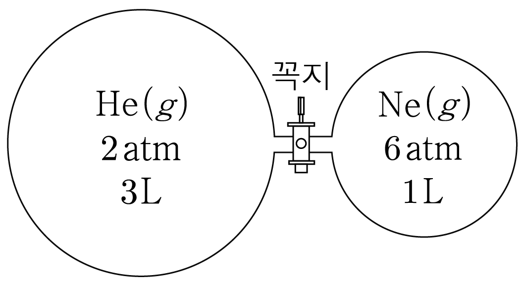 꼭지를 열고 충분한 시간이 흐른 후 H e ( g ) \mathrm{He}(g)H e ( g ) , N e ( g ) \mathrm{Ne}(g)N e ( g ) 의 부분 압력을 각각 P H e P_\mathrm{He}P H e , P N e P_\mathrm{Ne}P N e 이라 할 때 이상 기체 법칙을 적용하면 아래와 같다.