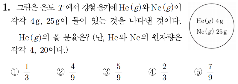 H e \mathrm{He}H e 의 원자량은 4 44 이므로 (가)에서 H e \mathrm{He}H e 의 몰 수는 4 g 4 g / m o l = 1 m o l \frac{4\,\mathrm{g}}{4\,\mathrm{g/mol}} = 1\,\mathrm{mol}4 g / m o l 4 g = 1 m o l 이다.
