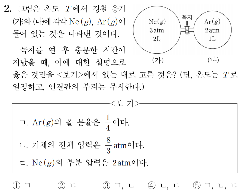 N e ( g ) \mathrm{Ne}(g)N e ( g ) 의 부분 압력은 8 3 a t m × 3 4 = 2 a t m \frac{8}{3}\,\mathrm{atm} \times \frac{3}{4} = 2\,\mathrm{atm}3 8 a t m × 4 3 = 2 a t m 이다. (O)