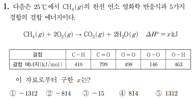 다음은 에서 와 의 반응의 열화학 반응식과 가지 결합의 결합 에너지이다. 자료로부터 구한 는?