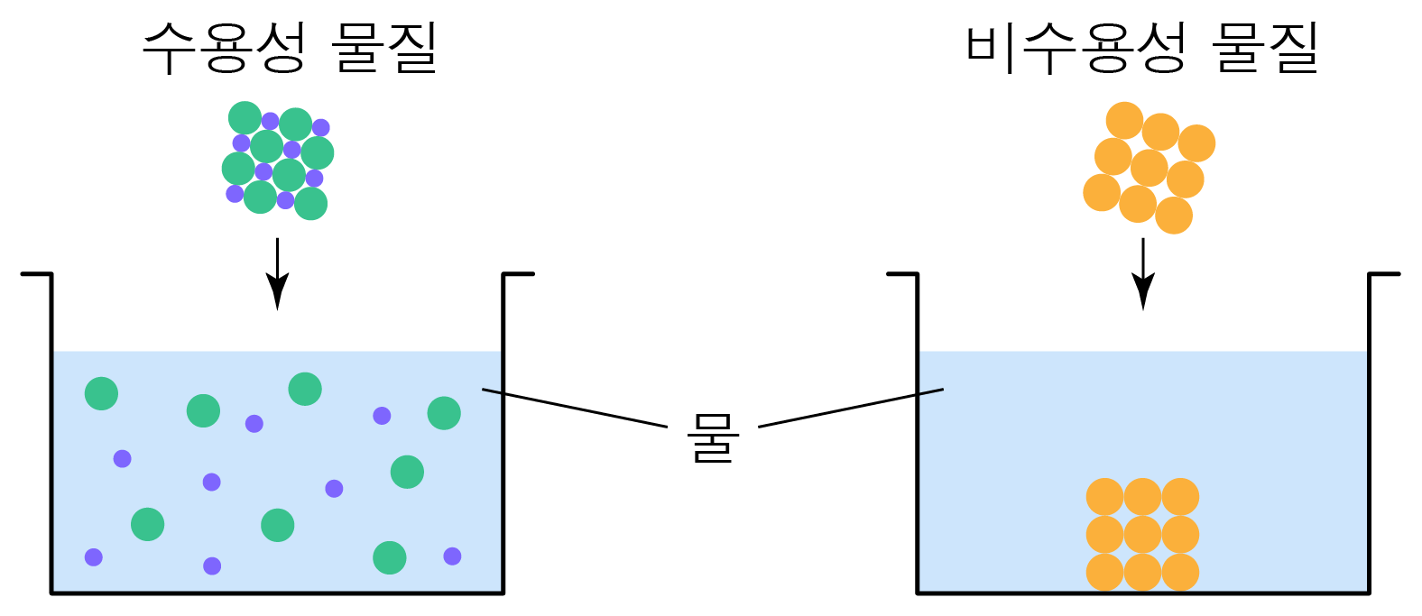 용매가 물인 경우 물에 녹는 성질을 수용성, 물에 녹지 않는 성질을 비수용성이라 한다.