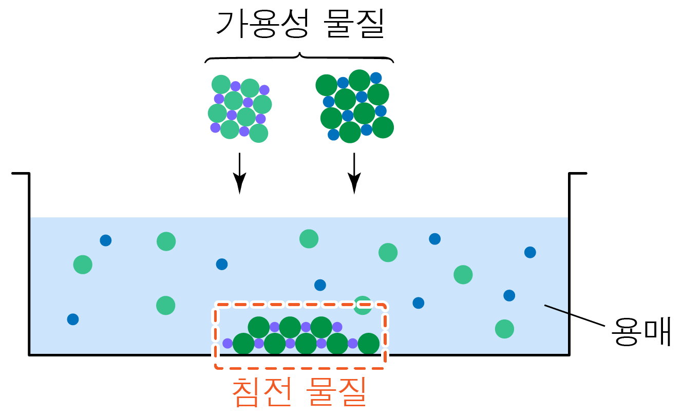 특정 용매에 녹는 성질을 가용성, 녹지 않는 성질을 불용성이라 한다.