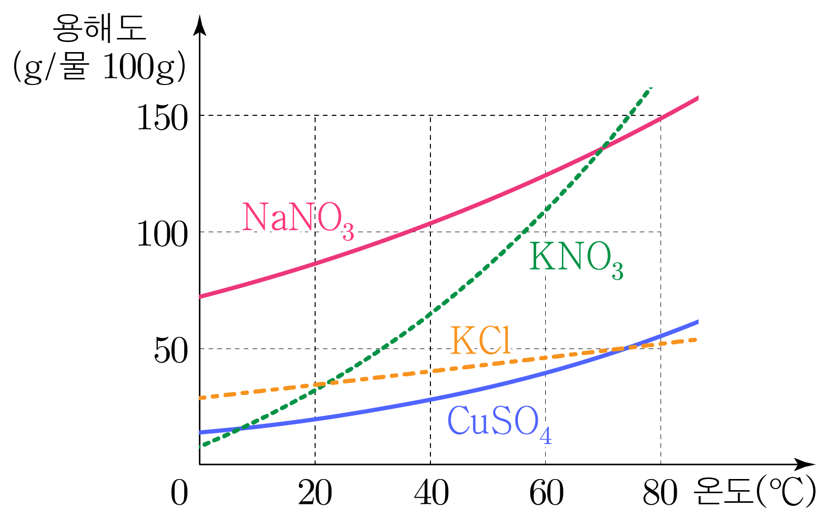 그림은 예시로 고체 물질인 질산 나트륨(), 질산 칼륨(), 황산 구리()(), 염화 칼륨()의 온도에 따른 물에 대한 용해도를 나타낸 것이다.