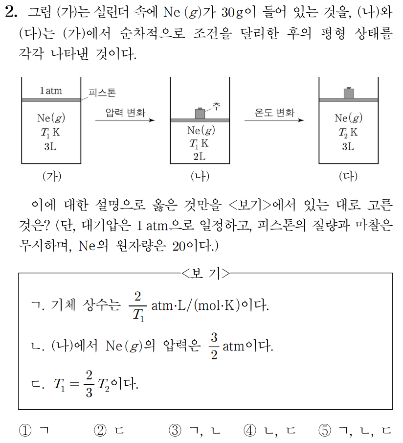여기서 ㄱ에서 구한 R=T1mol⋅K2atm⋅L를 대입하면