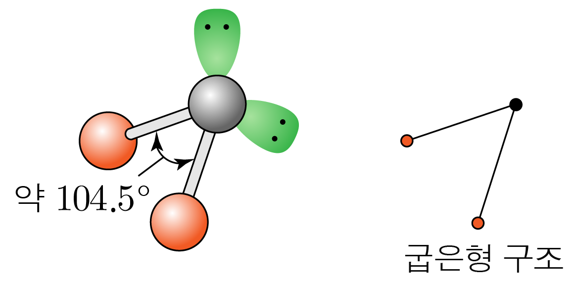 결합각은 약 104.5∘이고, 굽은형 구조이다.