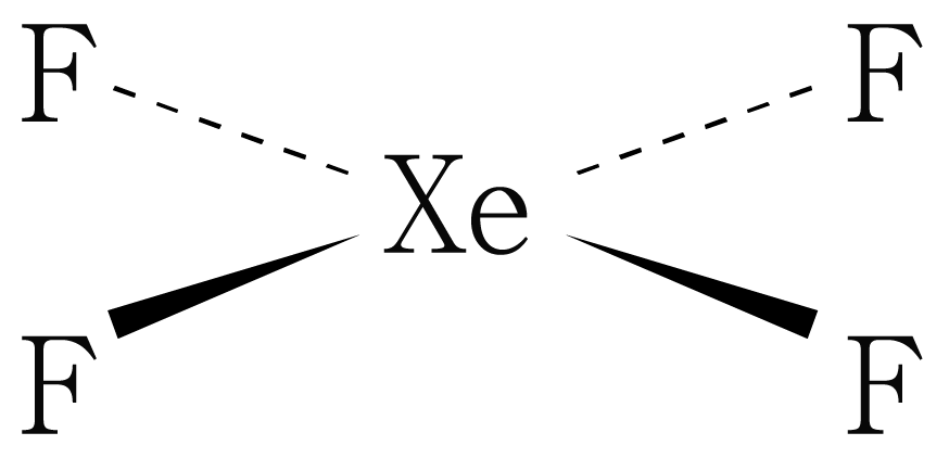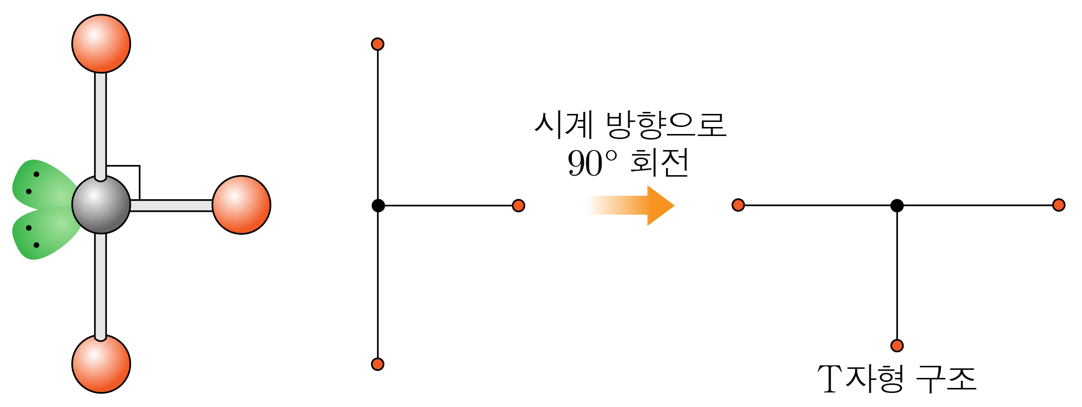 주황색 공은 F를, 검은색 공은 Xe(원자 번호가 54인 원소)를, 초록색 구름은 비공유 전자쌍이 차지하는 공간을 나타낸다.