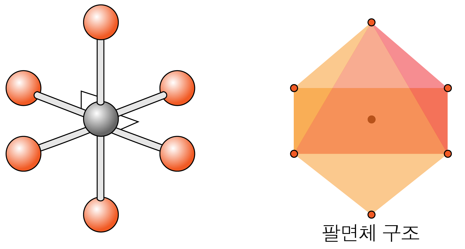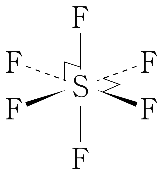 따라서 SF6의 수평면에서 결합각은 90∘이고, 수평면과 수직 방향의 결합각은 90∘이며, 팔면체 구조이다.