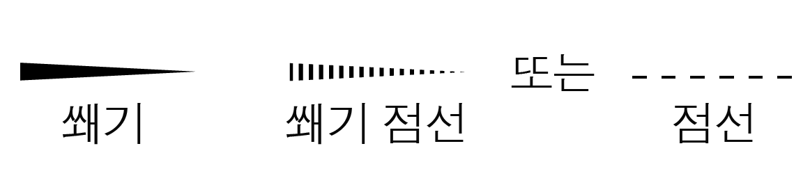 관찰자 반대 쪽으로 들어간 부분은 쐐기 점선 또는 점선을 통해 나타낸다.
