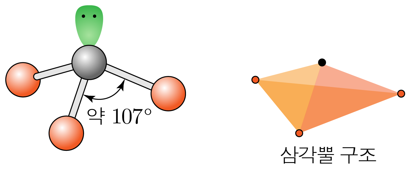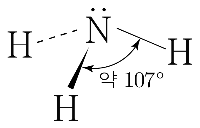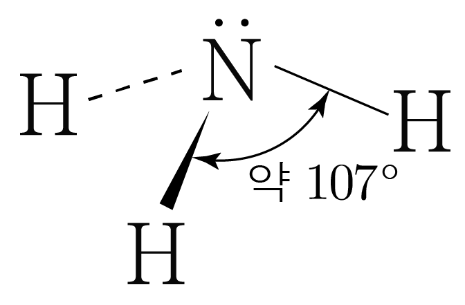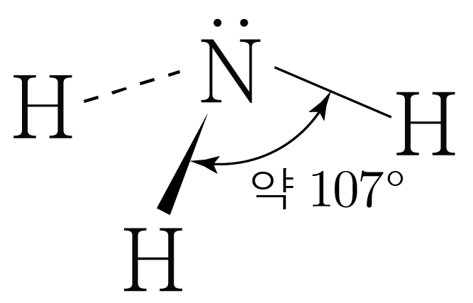 따라서 NH3의 결합각은 약 107∘이고, 삼각뿔 구조이다.