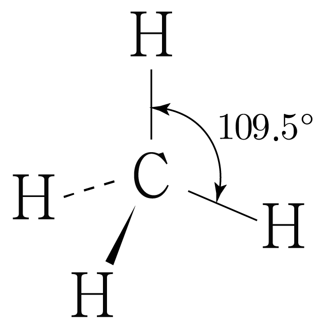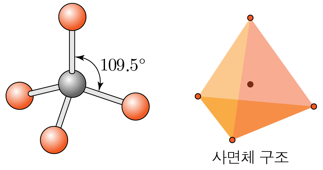 따라서 CH4의 결합각은 109.5∘이고, 사면체 구조이다.