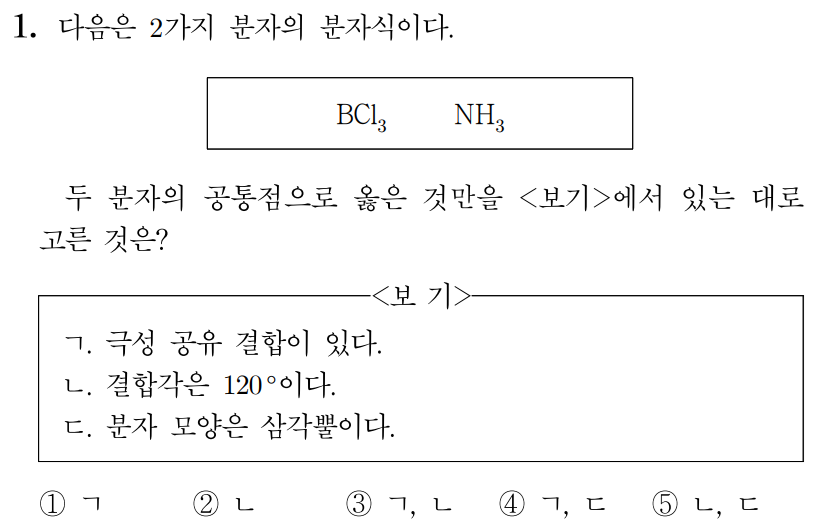 ㄷ. BCl3의 분자 모양은 평면 삼각형이고, NH3의 분자 모양은 삼각뿔이다. (X)