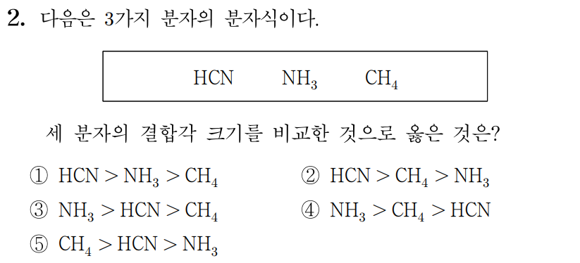 세 분자의 결합각 크기를 비교하면 HCN>CH4>NH3이다.